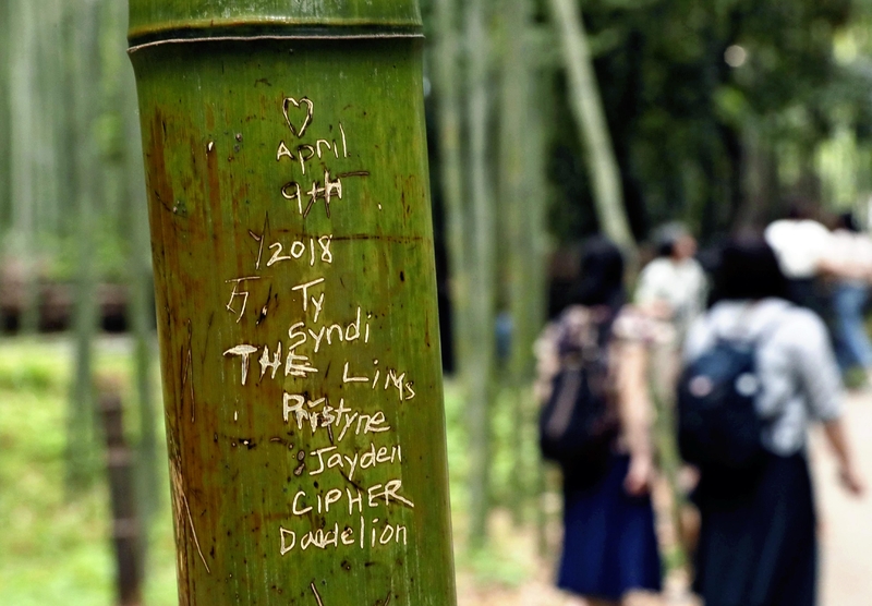 KYOTO -- More than 100 bamboo trees along a walkway near a well-known bamboo grove path, a tourist site in the Arashiyama district of Kyoto, were found to have been defaced with carvings, the Kyoto city government said.