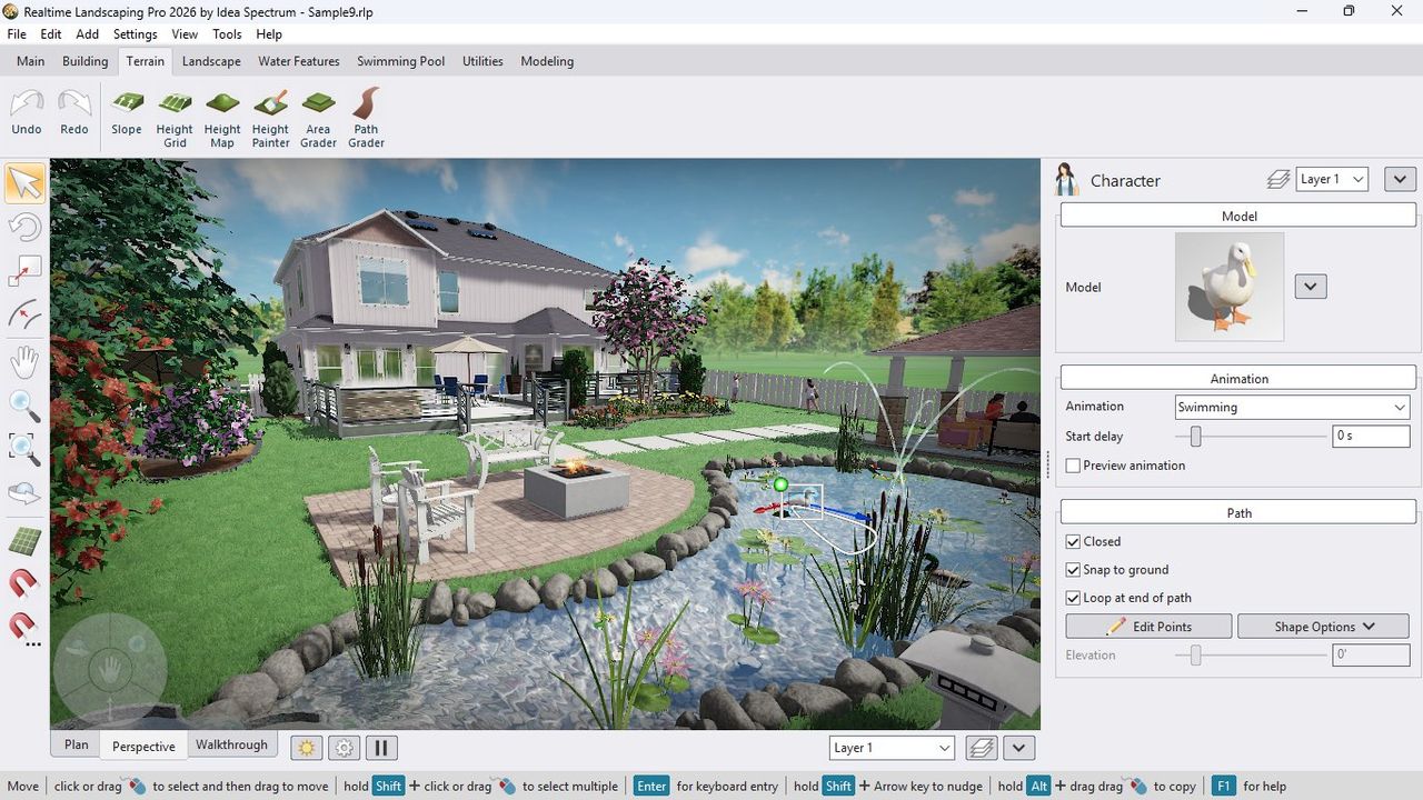 But what we particularly enjoyed was how you can bring your design to life through animation. Water can shimmer, and fountains flow, for instance. But people - and even animals - can be animated as well. Some can walk, others jog, and a few even swim. Set a path for them to follow and they’ll repeat their action on a loop.