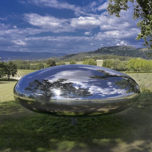 Wandering from the building out through the vineyards towards the hills, the art trail meanders across grassland and rocky terrain and occasionally under the canopy of large forest trees. Tom Shannon’s Drop (2009) seems to hover like a silver spaceship above the vines.