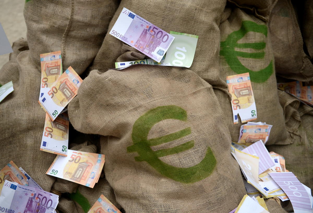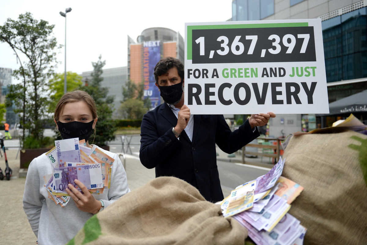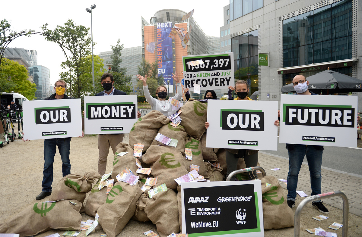 Neubauer joined a group of activists outside the EU headquarters in Brussels on Friday, where they laid out large bags emblazoned with euro signs, demanding that recovery cash is spent on protecting the planet for future generations.