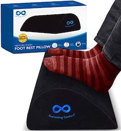This under-desk footrest places your feet in a comfortable and ergonomically correct position to improve your seated posture and alleviate discomfort. The memory foam pillow molds to the shape of your feet for incredible comfort, and a nonslip bottom keeps it in place. The comfy velour cover is both removable and machine washable.