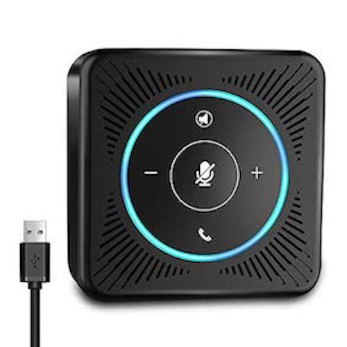 This conference speakerphone easily plugs into most computers, and features four mics to accommodate up to four people in one room. It delivers quality sound, offers auto echo cancellation, and works with all the major communication platforms including Skype, Google Hangouts, Zoom, and more.
