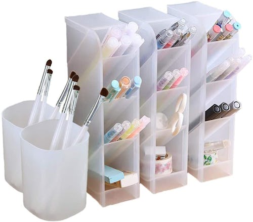 This five-piece desk organizer set keeps your pens and pencils visible and within reach when you need one. Made from durable plastic, this set includes two pencil cups and three stackable organizers. Each organizer has four slots with an angled design that keeps the contents from falling out, and they can be placed horizontally or vertically. These organizers also work well for makeup brushes, crafts, and kitchen utensils. Choose between black and white plastic.