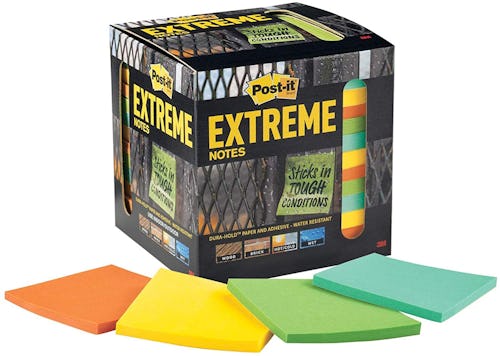 These Post-It Extreme notes can be used indoors and outdoors, rain or shine. Made with Dura-Hold paper and adhesive these notes are water-resistant, stick to textured surfaces, and still remove cleanly when you’re done. Get 12 pads in each pack with 45 sheets in each pad.