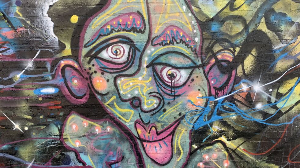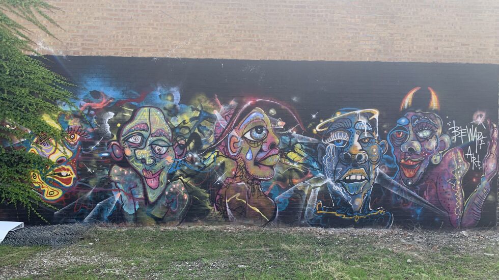 There’s something unsettling about the contorted faces painted on a brick wall of a building on Belmont Avenue just east of California Avenue.