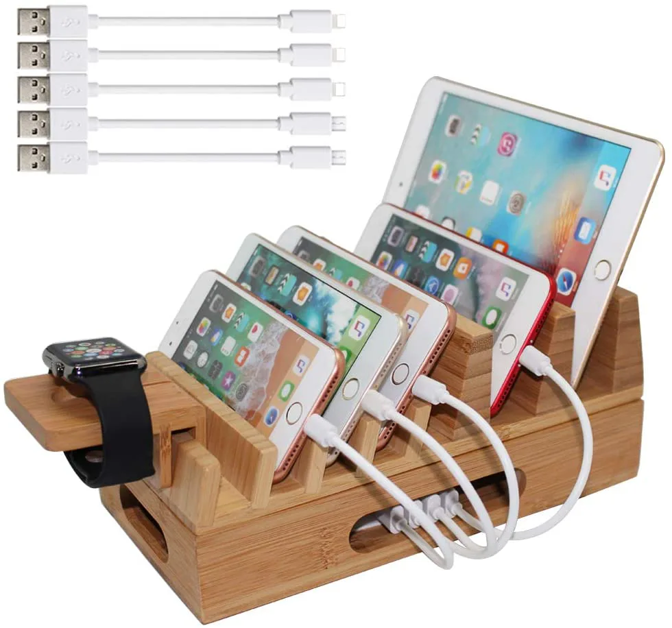 Gather all of your gadgets — your phones, watch, tablets, and laptops — into this tidy, organized, bamboo charging station and stop searching for cables and hating the mess. This elegant bamboo box has room underneath for your own USB charging hub and slots that are strong enough to hold your phones and tablets vertically — the last two will hold laptops. Charger and cords are not included.
