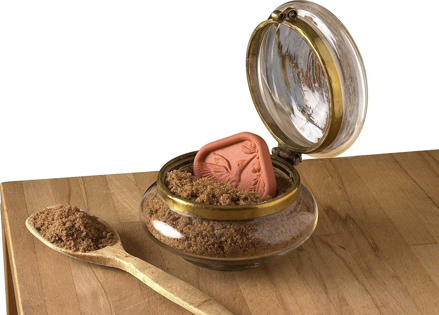 Soften rock-hard brown sugar and keep it fresh for up to six months with this brown sugar saver. Just soak the clay disc in water, then place it in an airtight container with the sugar. Use it for popcorn, spices, marshmallows, and dried fruit too.