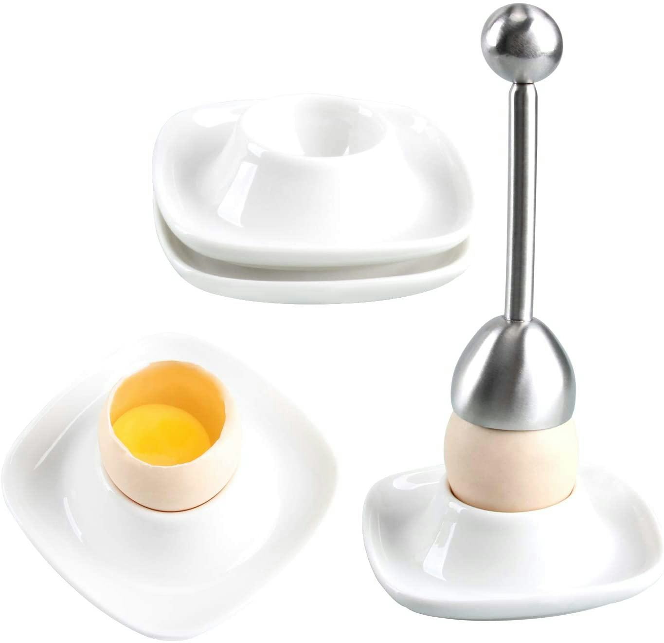 If boiled eggs are your go-to breakfast, this stainless steel egg cracker topper is for you. It includes a calibrated eggshell cutter that cleanly and efficiently scores the eggs and four ceramic cups, so you can enjoy breakfast with family or friends.