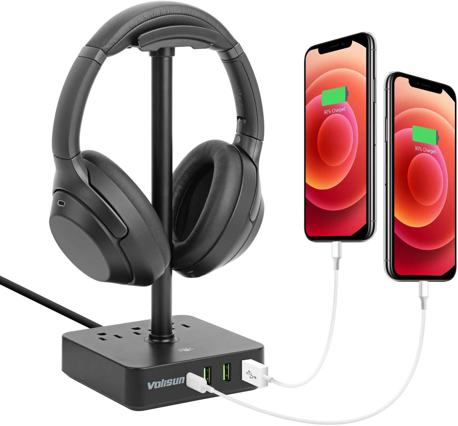 This headphone stand features three USB ports and one USB-C port, so you can charge phones and tablets, but it's also outfitted with three AC outlets, so you can plug in lamps, laptops, and other small appliances. If you're looking to clear up desk or nightstand clutter, this is a worthy buy.