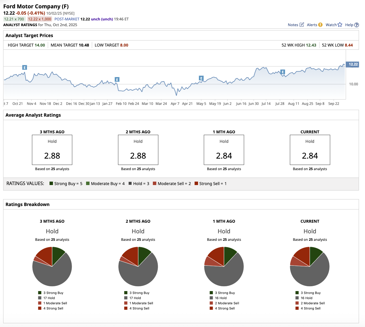On Wall Street, F stock is rated an overall “Hold.” Of the 25 analysts that cover the stock, three rate it a “Strong Buy,” 16 rate it a “Hold,” two say it is a “Moderate Sell,” and four rate it a “Strong Sell.” Ford’s stock has surpassed the average analyst target price of $10.48. However, its high target price of $14.00 implies that the stock could rise as much as 14.5% from current levels.
