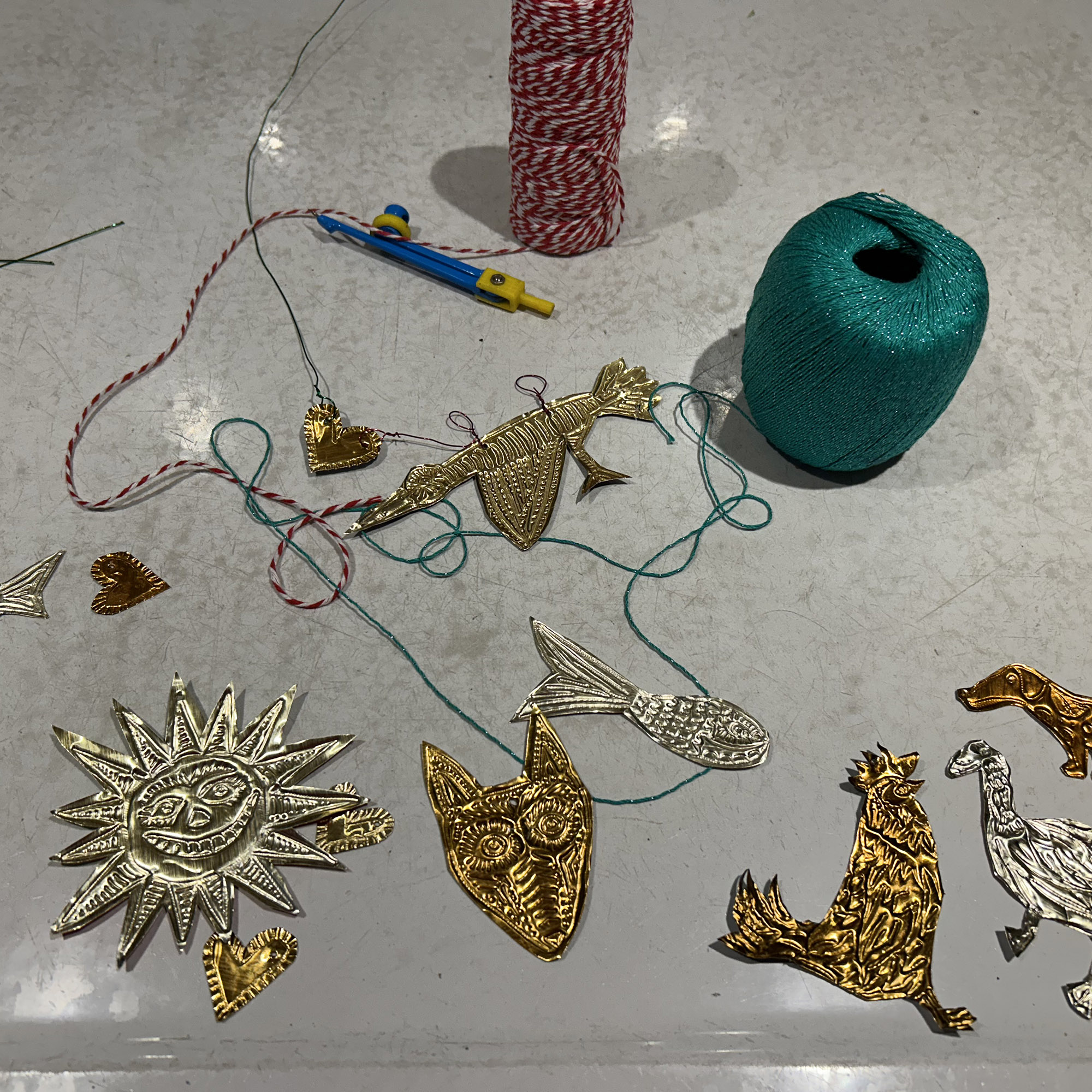Last year we tried the viral metal garland using empty tomato purée tubes after seeing @theprintedpeanut’s post. Snip off the ends, cut down one side, wash it out, and you have a sheet of gold metal. We embossed patterns using a biro and a compass before cutting them out and stringing them along wire.
