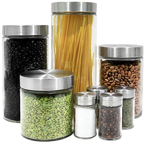 Estilo 8 Piece Glass Canisters And Spice Jar Set with Stainless Steel Screw On Lids, Clear