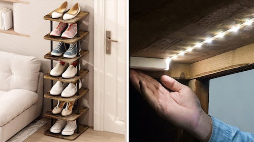 Get rid of shoe clutter while keeping them where you like to put them on by putting them all into this vertical shoe storage organizer. It holds seven pairs of shoes in the same footprint one pair requires, taking advantage of vertical space instead of floor space. “Fits perfectly in my small space near the door for my shoes,” said one reviewer.