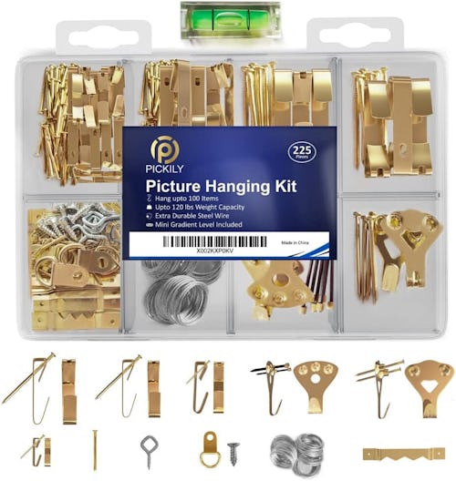 Be ready to hang anything with this picture hanging kit that has all the picture hangers, nails, and wire you are likely to need. Whether you are hanging a light photo or a mirror that weighs 100 pounds, the tools you need are here — and organized into compartments so you can locate them.