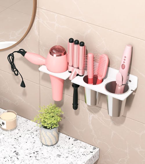 Do you envy the orderly system your hair stylist has for all the combs, scissors, hairdryers, and other tools of the trade? Apply that same system to your own space with this hair tool organizer that mounts to the wall. Drop styling tools into the two stainless steel cups without worrying about letting them cool down first. Drop your hair dryer into a holster. Everything is ready to use but looks tidy.
