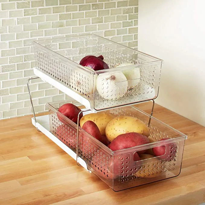 Tuck this two-tier organizer under the sink, in the fridge, or in a corner of the counter to keep everything from beauty products to potatoes organized and within reach. The bins slide out completely, assemble easily, and its perforations let products dry or aerate.