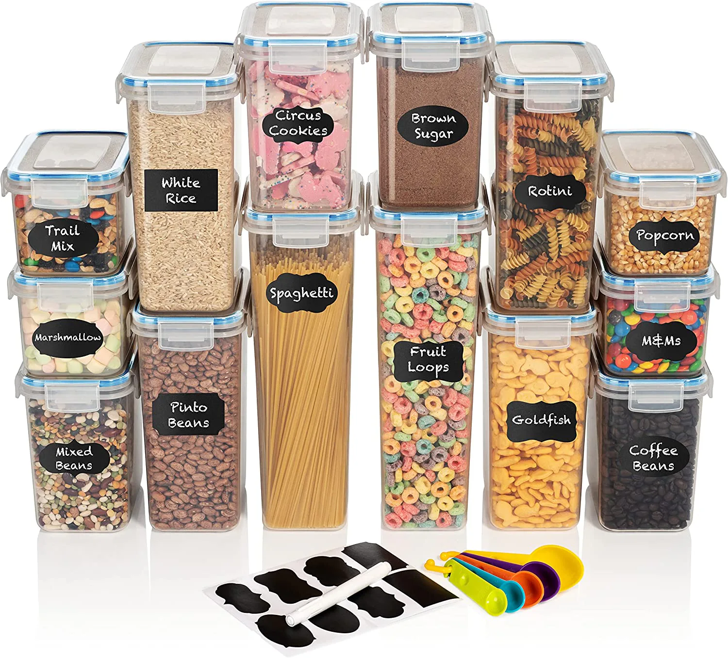 Move all your dry goods into these stackable containers for a tidy kitchen or pantry. The set includes seven clear containers in a variety of sizes to hold items like cookies, rice, or spaghetti, and will fill the space in your cupboards efficiently while keeping everything fresh and dry because the lids seal tightly. The wide openings makes them easy to fill, and they come with reusable labels.