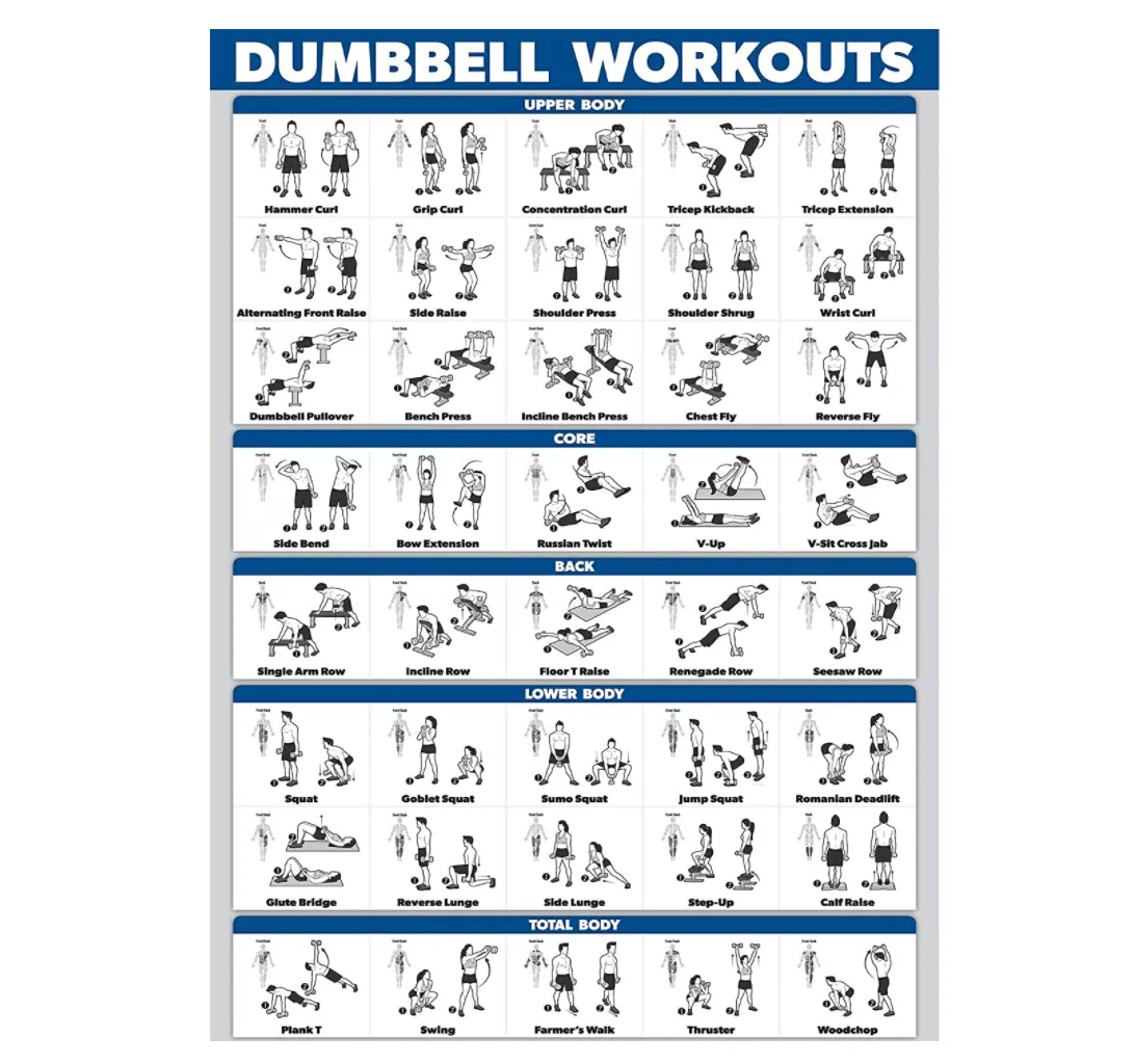 We weren't all born knowing how to work out with weights — and even if you once knew, it's easy to forget (especially when you aren't at the gym). Hang this chart on the wall and use it as a reference or teacher. It's organized by body region and includes the names and illustrations of the exercises. There are 40 moves printed on both sides of a laminated 18-by-27-inch poster.