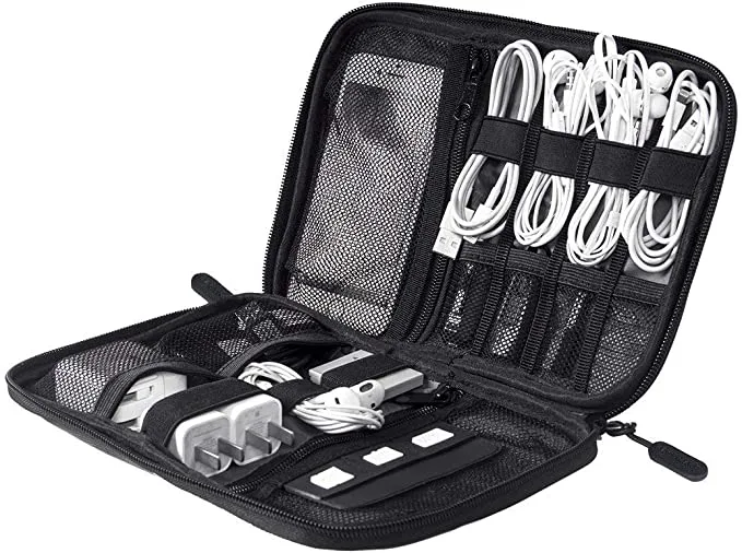 Keep all your cables and adapters in one place with this electronics organizer that can be zipped up for travel and outings, or kept at home for simple storage. It has multiple compartments sized for common tech accessories, including zipper pockets for hard drives or phones, loops for cords, and slots for SD cards. It comes in three colors, and the exterior nylon is water-resistant for added protection.