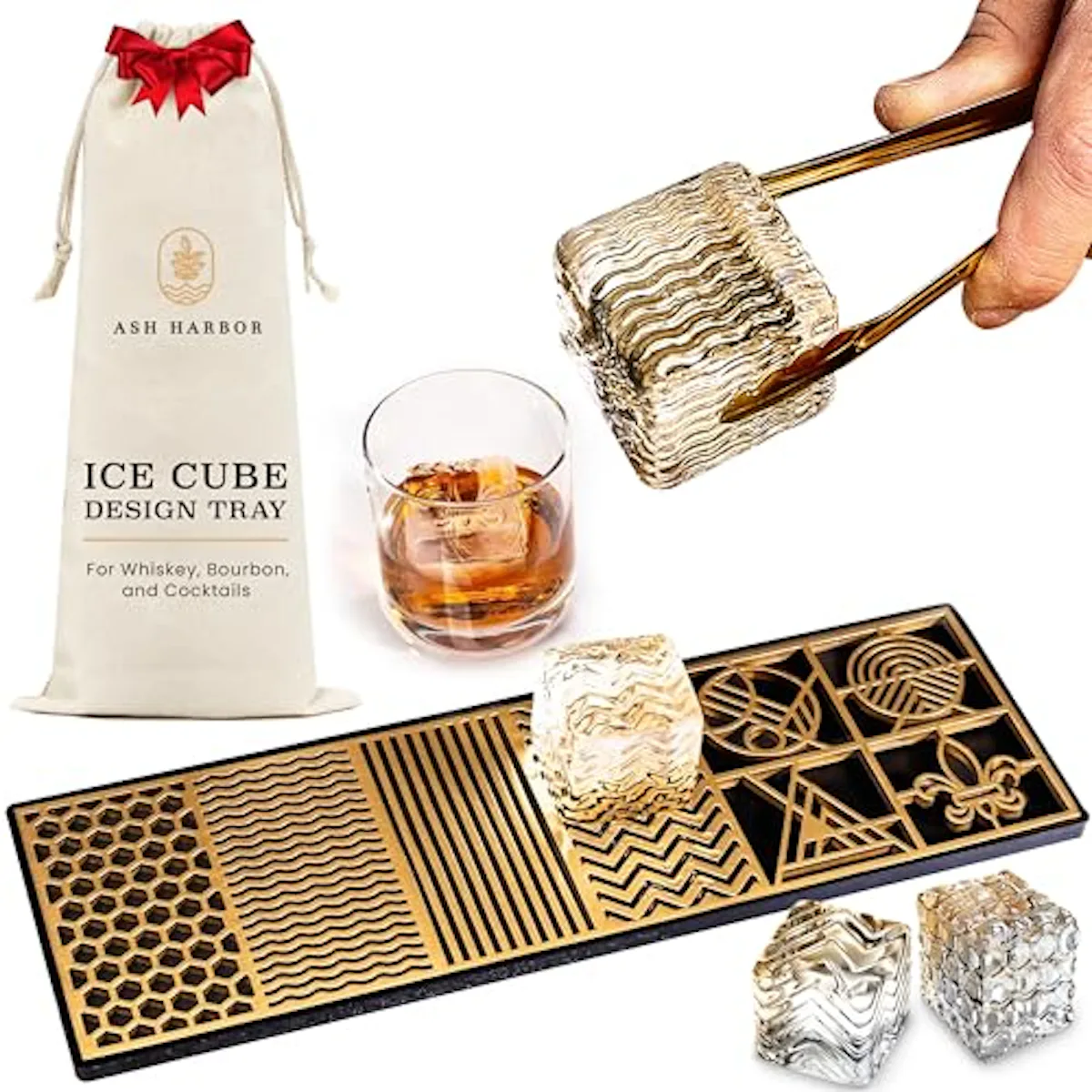 Clear Ice Cube Maker Design Tray - Craft Modern Ice Molds for Bourbon & Cocktails in 5 Seconds - Whiskey Mold Cube Stamp – Bartender Accessories - Copper Ice Press Cocktails by Ash Harbor (Patterns)
