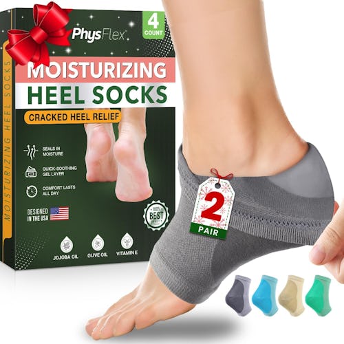 Slip on these overnight heel socks and give your feet spa-level care for a fraction of the price. Infused with vitamin E, jojoba oil, and olive oil, they deliver targeted moisture to dry, cracked heels, helping soften rough skin while you snooze. The flexible, breathable cotton/polyester/spandex blend fabric stays comfortably in place overnight and is fully reusable — just machine wash them cold and air dry to keep them working night after night. Each set comes with two pairs.