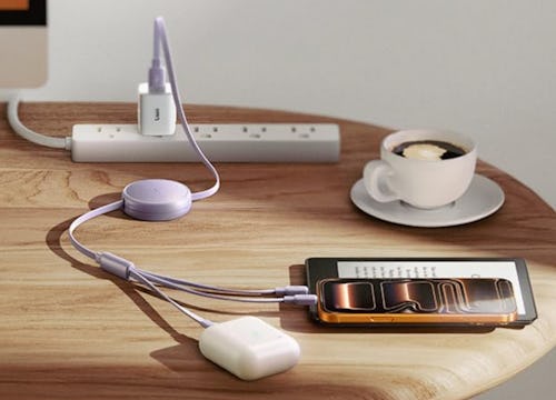 Make a small investment in this charging block, and it will reward you with fast-charging power and clutter-free spaces. A 65-watt USB-C port supports fast laptop charging, while additional USB-C, USB-A, and lightning outputs allow up to four devices to charge simultaneously. Two built-in retractable cables keep cords tucked away when not in use, and a compact build makes it travel-friendly.
