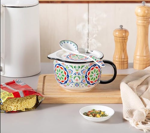 This colorful ceramic bowl is a clever multitasker that turns a quick bite into an intentional meal. The vessel itself has a generous 32-ounce capacity, while the lid works as a cover, side plate, spoon rest, or saucer. It’s microwave- and dishwasher-safe, includes a matching spoon, and looks polished enough for desk lunches, dorms, or solo dinners at home. Available in multiple patterns.