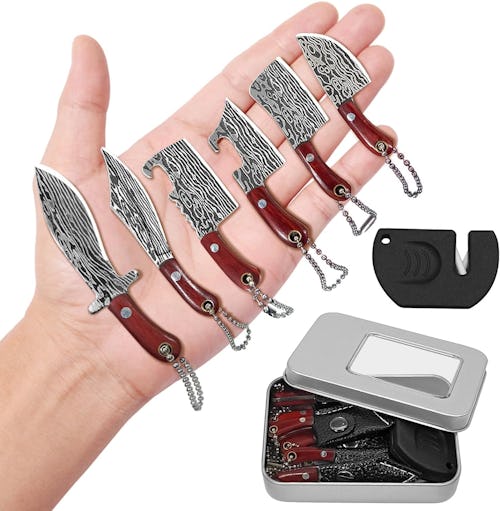 This knife set looks as if it was designed for a dollhouse, but it’s really a collection of functional tools with personality. It includes six knives in different shapes, each with its own sheath and keychain, plus a mini sharpener and a storage tin. The blades are made from durable, rust-resistant stainless steel, while the solid wood handles provide a secure, comfortable grip. Designed for everyday utility, they work as box cutters, letter openers, and even light-duty fruit knives.