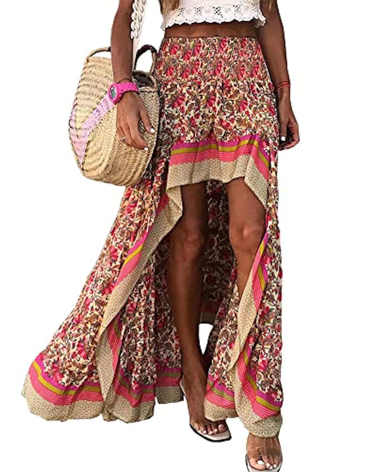 BTFBM Women 2025 Summer Spring Boho Long Skirts Dress Floral Print Elastic Waist Split Ruffle High Low Beach Maxi Skirt(X-Red, Medium)