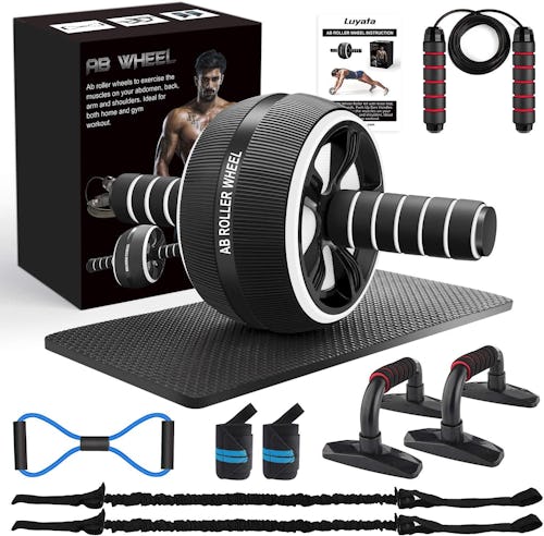 This 10-in-one floor workout kit includes an ab roller to work your core, two resistance bands for an additional challenge, a length-adjustable jump rope for cardio, a set of armbands for stretching, wrist wraps for stability, a knee pad for cushioning, and non-slip pushup bars to improve comfort and posture.