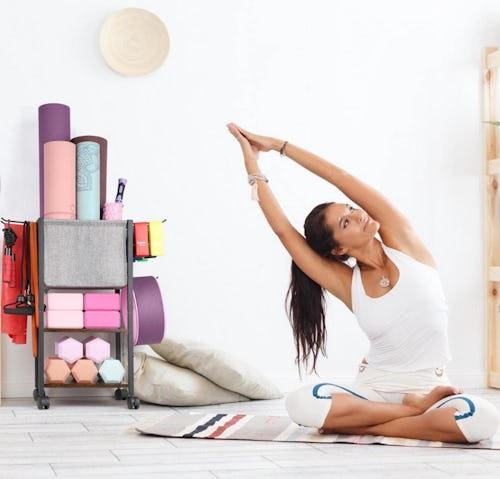 Looking to streamline your workout area so it’s neat, functional, and stylish? This equipment organizer has shelves for weights, hooks for jump ropes and resistance bands, and a basket for yoga mats and foam rollers. It’s made from wood, metal, and tear-resistant canvas with caster wheels for portability.