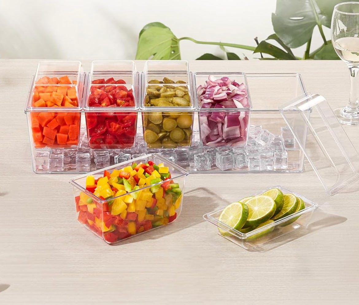 If you love dining al fresco or entertaining in your yard, this condiment caddy is a great buy. It comes with five separate containers that are just the right size for garnishes like lemon or onion slices, a little fruit for snacking, or barbecue extras like ketchup. You fill the bottom with ice to keep everything chilled, and each case has its own lid to keep everything safe.