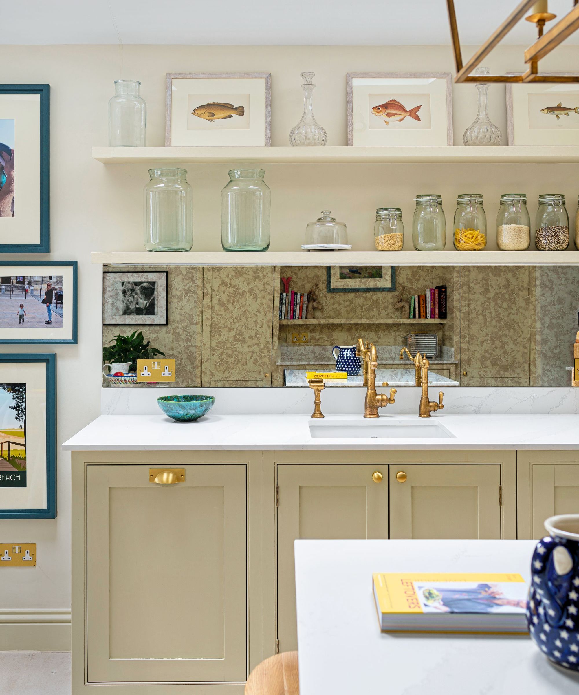 This type of repetition can be applied to many other rooms of the house, too, like the kitchen. In the kitchen above, the two open shelves set the scene for repetitive decorative accessories. The bottom shelf features a collection of glass jars for storing food while the top shelf features carafes and artworks that create a sense of harmony against the wall. Plus, the gold accent details act as a form of repetition, too – from the cabinet knobs to the faucet and even the outlet covers.