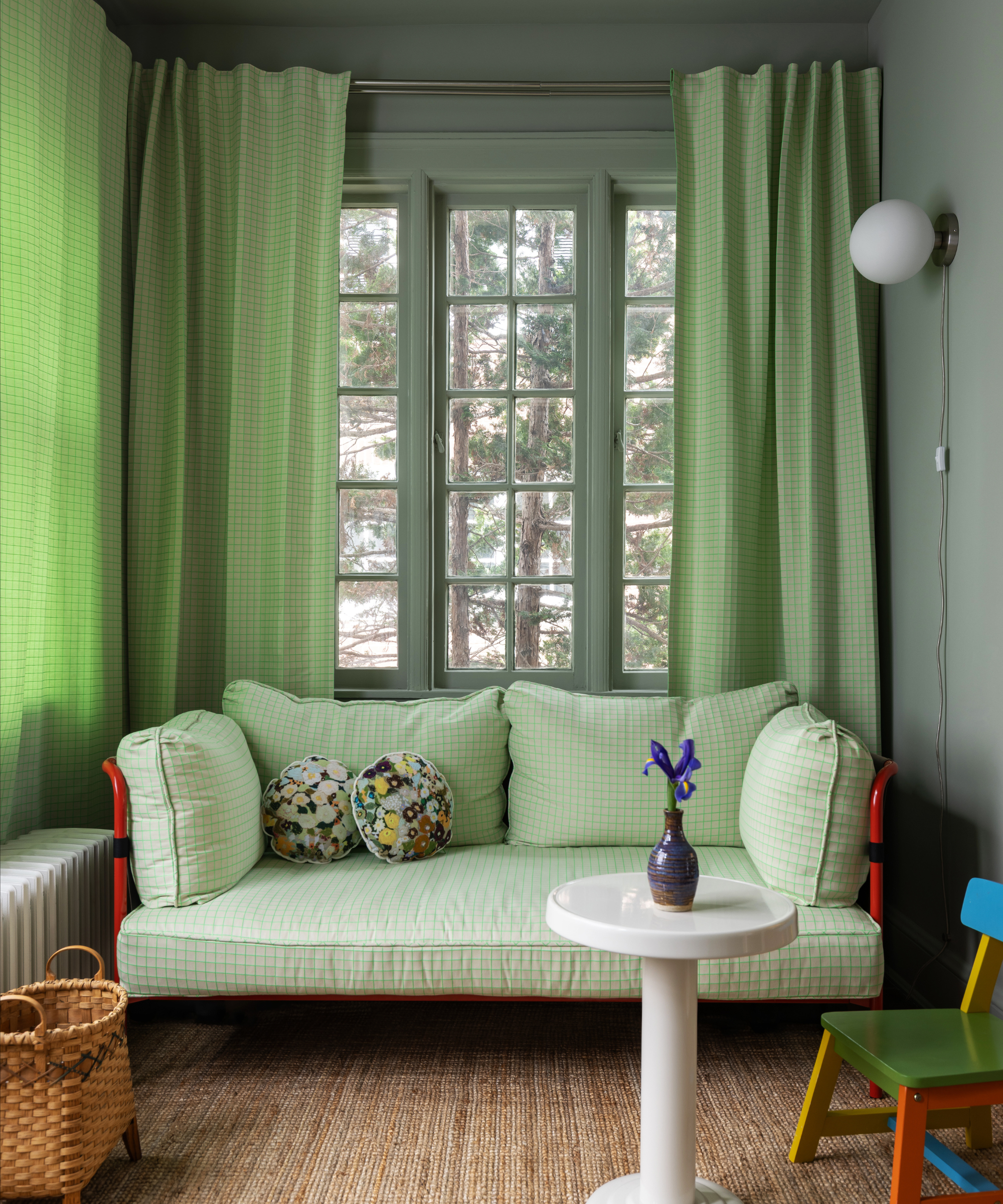 As you can see, Robin and Jen used this fabric for the curtains as well as the sofa cushions. 'It sets the whole tone for the space and because it's repeated, it doesn't bowl you over the head with its bright colors and graphic pattern,' they explain. Plus, this neon green print is tastefully complemented with the soft green wall color – an example of repetition through color.