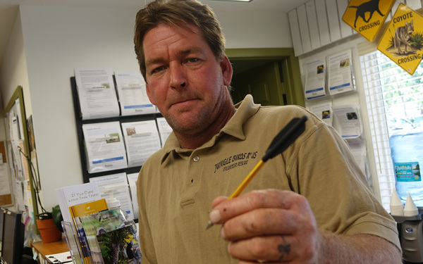 Daniel Drake, a state-licensed wildlife rescuer who provides his services for free, received a report of an iguana in distress, with needles or darts sticking out its body.