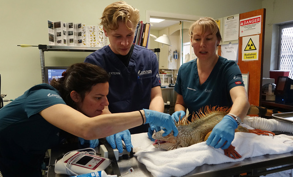 The iguana was given pain medication and scheduled to undergo surgery that afternoon at the wildlife center, where the iguana's large size led the staff to nickname him "Godzilla."