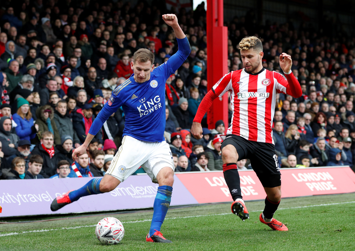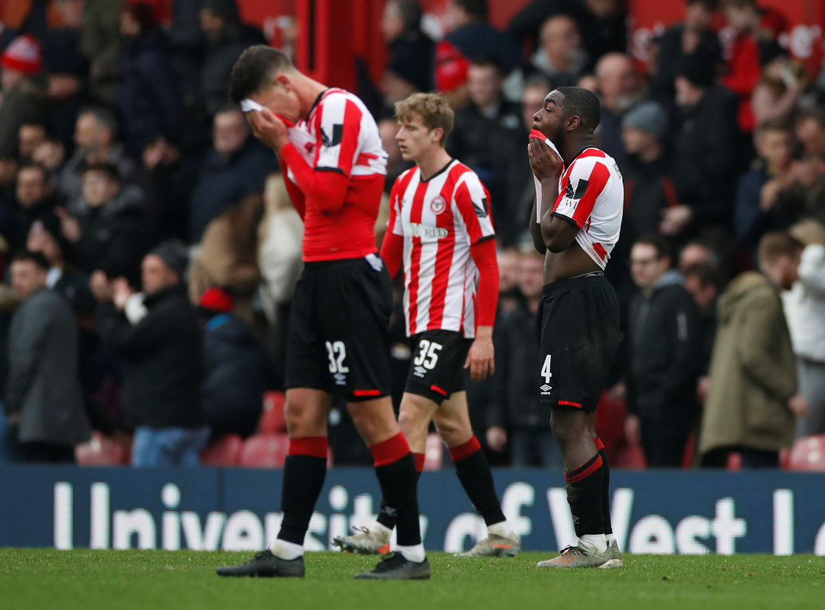 Soccer Football - FA Cup Fourth Round - Brentford v Leicester City - Griffin Park, Brentford, Britain - January 25, 2020 Brentford's Dru Yearwood and teammates look dejected after the match Action Images via Reuters/Paul ChildsSoccer Football - FA Cup Fourth Round - Brentford v Leicester City - Griffin Park, Brentford, Britain - January 25, 2020 Leicester City's Marc Albrighton in action with Brentford's Emiliano Marcondes Action Images via Reuters/Paul ChildsSoccer Football - FA Cup Fourth Round - Brentford v Leicester City - Griffin Park, Brentford, Britain - January 25, 2020 Brentford's Dominic Thompson in action with Leicester City's Demarai Gray REUTERS/Dylan MartinezSoccer Football - FA Cup Fourth Round - Brentford v Leicester City - Griffin Park, Brentford, Britain - January 25, 2020 Leicester City's Demarai Gray in action with Brentford's Dominic Thompson Action Images via Reuters/Paul ChildsSoccer Football - FA Cup Fourth Round - Brentford v Leicester City - Griffin Park, Brentford, Britain - January 25, 2020 Leicester City's Danny Ward in action with Brentford's Halil Dervisoglu REUTERS/Dylan MartinezSoccer Football - FA Cup Fourth Round - Brentford v Leicester City - Griffin Park, Brentford, Britain - January 25, 2020 Leicester City's James Justin and James Maddison celebrate after the match Action Images via Reuters/Paul ChildsSoccer Football - FA Cup Fourth Round - Brentford v Leicester City - Griffin Park, Brentford, Britain - January 25, 2020 Brentford's Emiliano Marcondes in action with Leicester City's James Justin REUTERS/Dylan MartinezSoccer Football - FA Cup Fourth Round - Brentford v Leicester City - Griffin Park, Brentford, Britain - January 25, 2020 Leicester City's Wes Morgan in action with Brentford's Halil Dervisoglu REUTERS/Dylan MartinezSoccer Football - FA Cup Fourth Round - Brentford v Leicester City - Griffin Park, Brentford, Britain - January 25, 2020 Leicester City's Demarai Gray in action with Brentford's Luca Racic REUTERS/Dylan Martinez