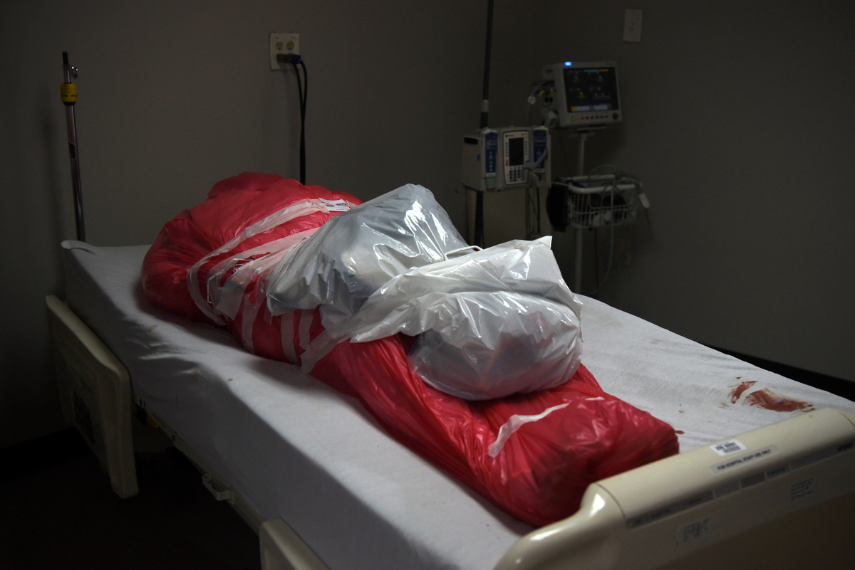 FILE PHOTO: A man who died of COVID-19 is wrapped in a body bag at the United Memorial Medical Center's coronavirus intensive care unit in Houston, Texas, June 29, 2020. The number of cases nationwide spiked to nearly 50,000 on July 1, the fourth record rise in infections in the last seven days. The United States has now reported more than 128,000 coronavirus-related deaths, nearly a quarter of the global total. REUTERS/Callaghan O'Hare
