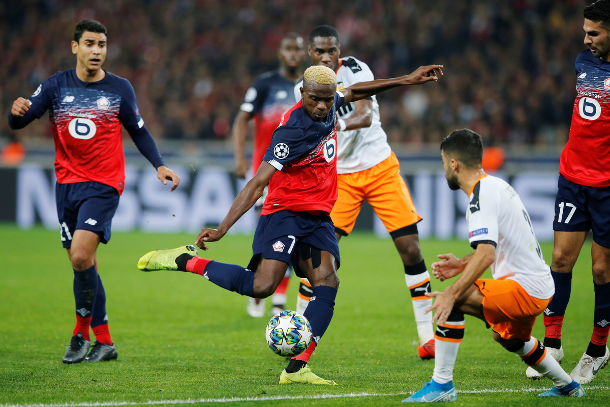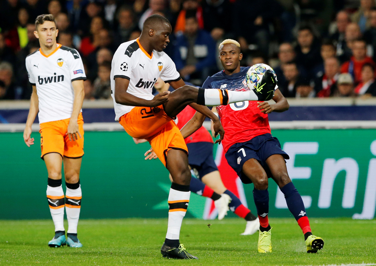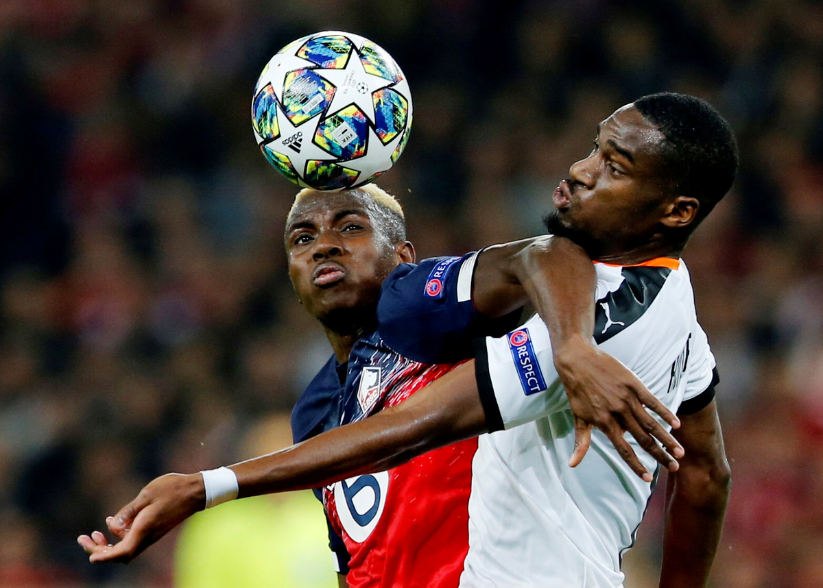 Soccer Football - Champions League - Group H - Lille v Valencia - Stade Pierre-Mauroy, Lille, France - October 23, 2019 Lille's Victor Osimhen in action with Valencia's Geoffrey Kondogbia REUTERS/Pascal Rossignol