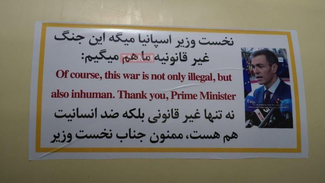 The stickers, written in English and Farsi, carry a quote attributed to Sanchez: "Of course, this war is not only illegal, but also inhuman. Thank you, Prime Minister."