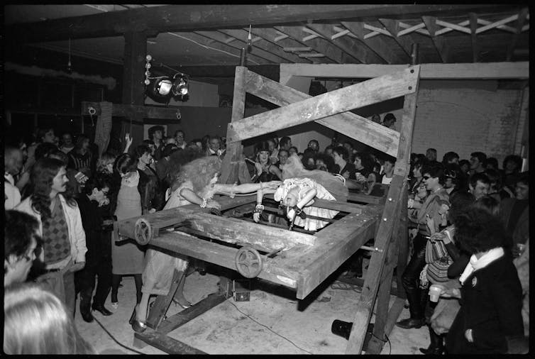Many are shots taken at private parties such as those held by Madame Lash in her warehouse. These pictures feature guests tied to a rack surrounded by crowds of party-goers. It is a part of Sydney’s recent cultural history that few people still alive have witnessed.