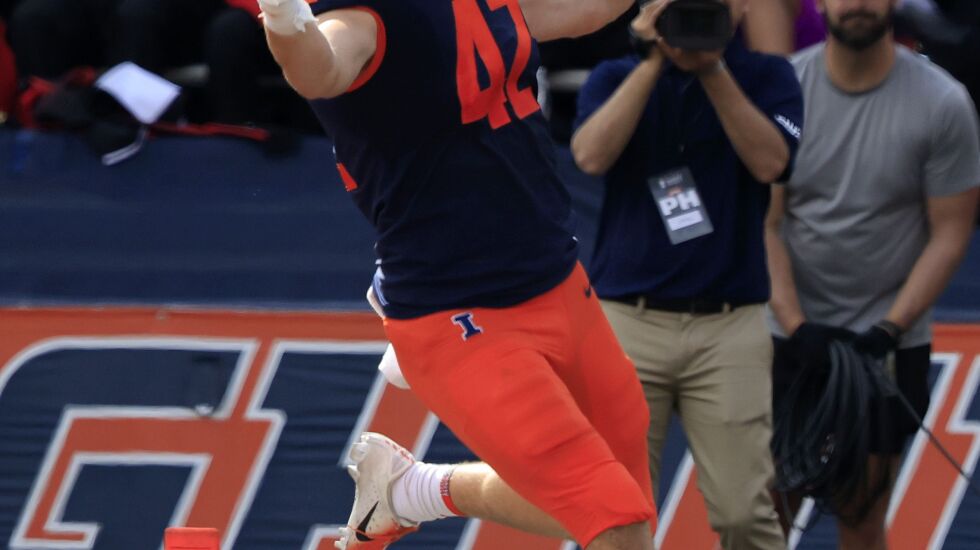 Tight end Michael Marchese, 24, likewise is in Year 6 with the Illini. He came in as a walk-on safety from Vernon Hills (Stevenson) and played special teams for a few seasons — a couple of starts mixed in along the way — before being switched to linebacker in Year 4. Eventually, Bret Bielema arrived, gave him a look at tight end in the spring of 2021 and put him on scholarship, something Marchese had hoped would happen sooner.