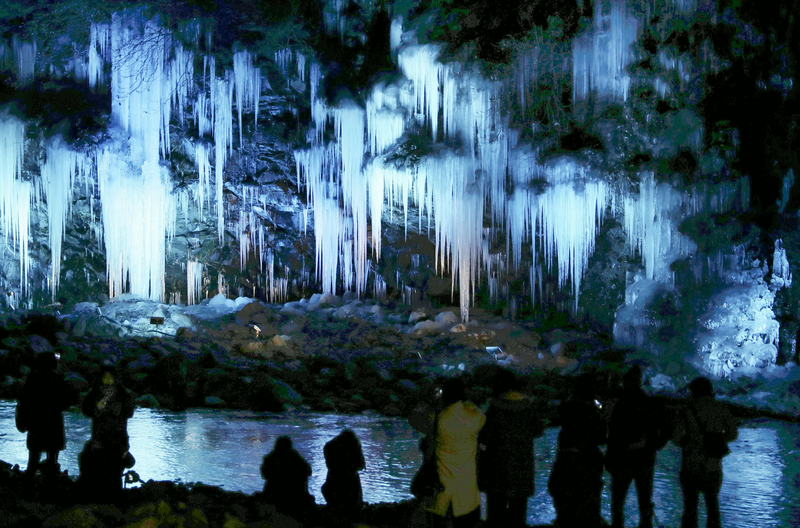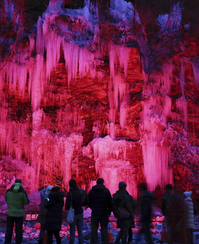 Clusters of icicles are illuminated in Chichibu, Saitama Prefecture, on Saturday. The Misotsuchi no Tsurara icicles form when springwater that seeps from rocks freezes. According to a local tourist organization, the naturally-formed icicles span an area about 10 meters tall and 30 meters wide, while the man-made icicles cover a rock wall about 25 meters tall and 55 meters wide. The illumination lasts through Feb. 11.