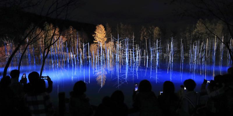 ASAHIKAWA, Hokkaido -- Tourists gathered at the Blue Pond in Biei, Hokkaido, for an illumination event that started at the popular tourist spot on Friday.