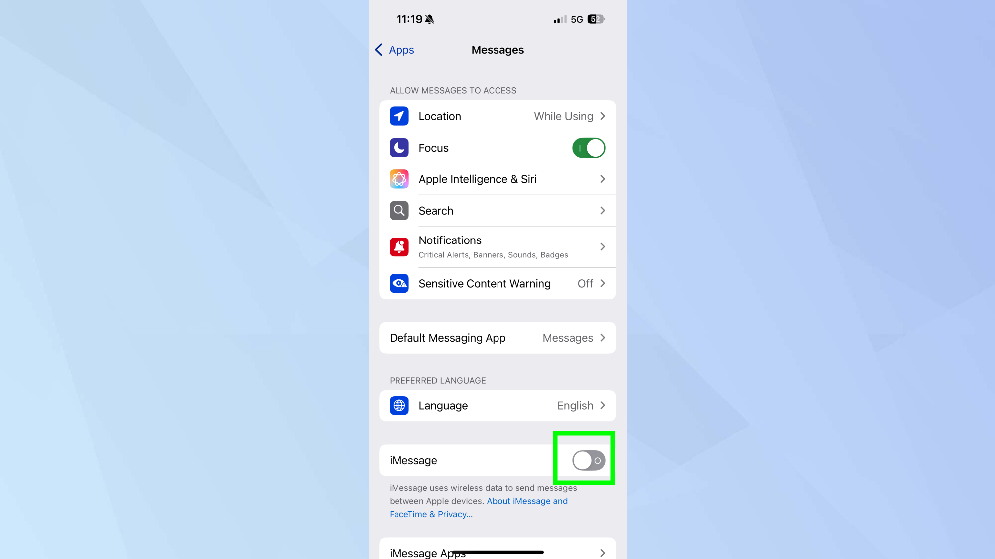 Tap Messages in the apps list to access messaging settings. Then find the iMessage toggle near the top of the Messages settings page. It should currently show as enabled (green), but it's not working properly despite appearing on.