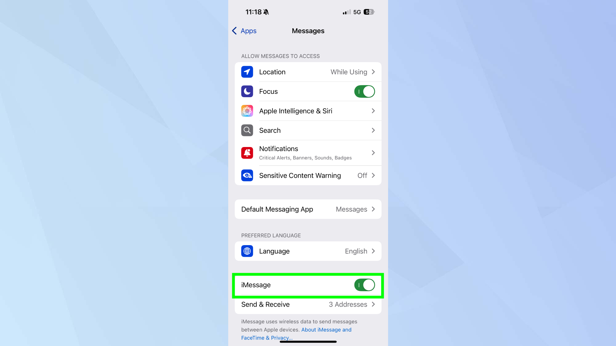 You should see a brief Waiting for Activation message. Once it disappears and the toggle stays green, iMessage is working properly with your phone number.