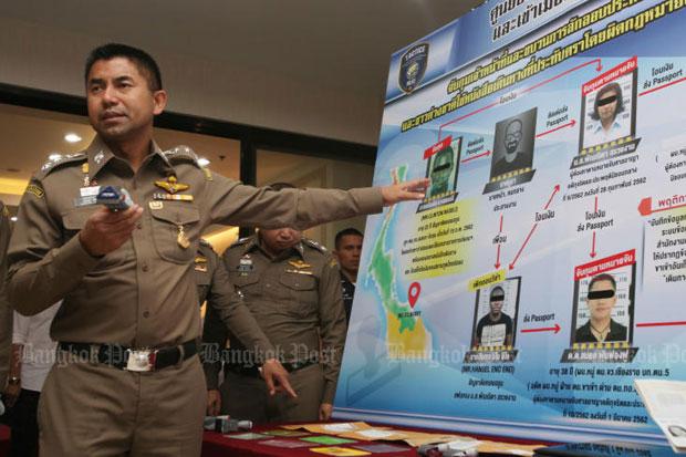 The trio are Pol Snr Sgt Maj Noppadon Booyawan, 38, Pol Sgt Maj Somyos Fumfongfu, 38, and Pannita Sruayngam, 37, the fixer. Ms Pannita confessed to charging foreigners 50,000 baht to arrange fake visa stamps.