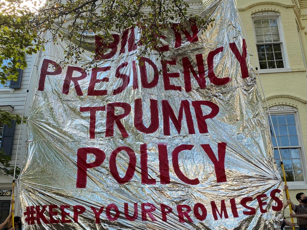 The blanket, 30 feet wide and emblazoned with the words “BIDEN PRESIDENCY, TRUMP POLICY” and the hashtag “#KeepYourPromises”, was designed to resemble the heat-reflecting emergency blankets given to migrant children detained by border police.