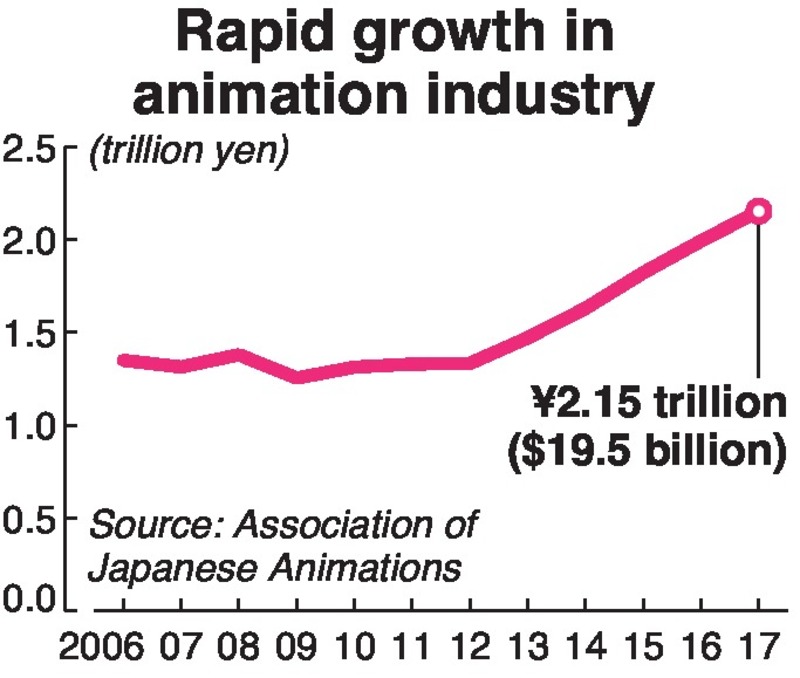 Despite Japan's anime-related sales of 2.15 trillion yen (19.5 billion dollars) in 2017 -- 1.6 times that of 2007 -- some work processes for making animation have been transferred to South Korea and other countries, such as those in Southeast Asia, due to the harsh working environment in Japan.