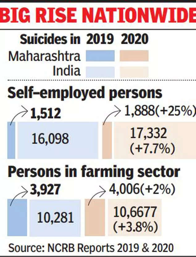 Among the states, Maharashtra, which has the highest Covid case tally (66 lakh) and toll (1.4 lakh), logged a 25% increase in suicides among vendors, tradesmen and small business owners. The NCRB report said 1,610 such self-employed individuals took their own lives in Maharashtra in 2020 as against 1,289 in 2019.